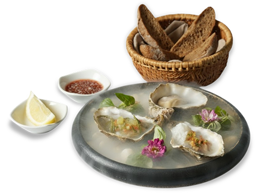 - Hàu Sống với Bánh Mì Nướng Lúa Mạch Đen, Giấm Hành Tím và Chanh