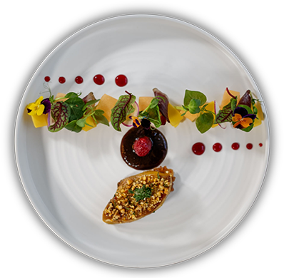 Gan Vịt Pháp Áp Chảo Tẩm Mật Ong Vị Truffle và Các Loại Hạt Nướng Giòn Kết Hợp với Salad Xoài Xanh Dưa Lưới và Ức Vịt Xông Khói, Mứt Đại Hoàng, Nước Mắm Cá Cơm Đỏ Vị Chanh Dây & Sốt Mâm Xôi.