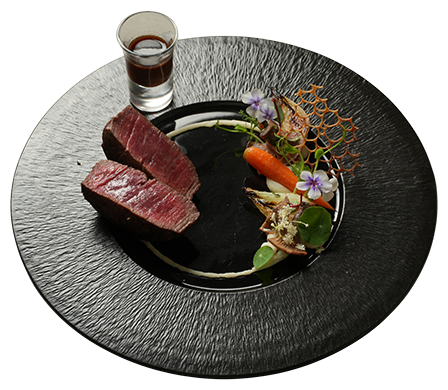 Thăn Bò Wagyu Shimo Australia MB 4/5, Nuôi Hạt 500 Ngày Dùng kèm Khoai Tây Nghiền, Cà Rốt Baby Nướng, Tỏi Confit, Nước Cam Vị Thì Là Cô Đặc, Nấm Rừng Xào, Hành Đỏ Nướng & Sốt Gan Ngỗng Vị Nấm Truffle.