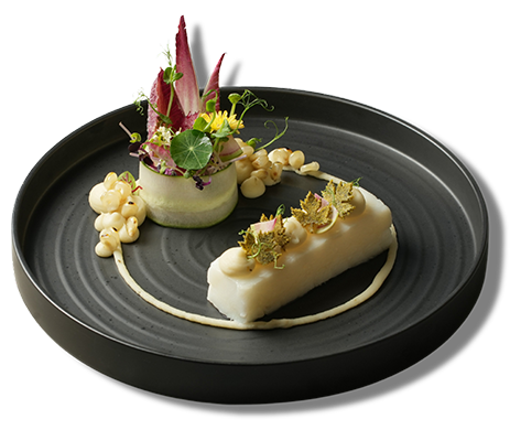 Cá Tráp Đỏ Nhật Bản Nấu chậm với Rong Biển Kombu dùng kèm Jerusalem Artichoke Nghiền, Trứng Cá Muối Sturia Oscietra Của Pháp, Rau Củ Baby Xào, Rong Biển Samphire Tươi, Sốt Nhím Biển với Dầu Cúc Vạn Thọ và Bọt Quất.