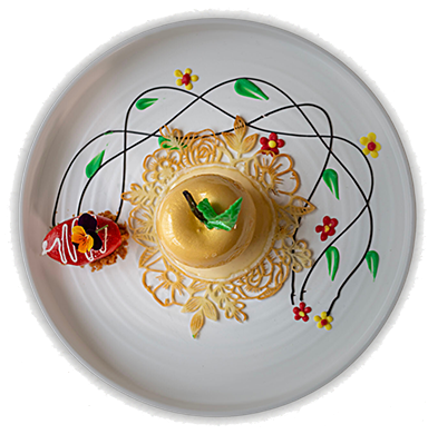 Bánh Tổ Chim Sông Hàn – Bánh Mousse Dừa Non Với Chocolate Trắng Nhân Sung, Sốt Chanh Dây Được Bao Phủ Bởi Lớp Vỏ Caramel Mặn Kèm Với Bánh Dừa Nướng, Sphere Chanh Dây, Caramel Vị Táo & Sốt Trái Cây Đỏ.